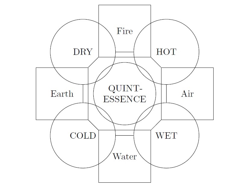 The four classical elements arise from the combination of the two properties of hotness and dryness, and their contraries of coldness and wetness. Fire and Water are obvious opposites, and so are Earth and Air, because they have no common properties. In contrary, Fire and Air share the property of hotness, Water and Air share the property of wetness, and so on. Therefore, since the four elements are two pairs of opposite elements, so also are the four properties; hotness being the opposite of coldness and wetness the opposite of dryness. This can be visualized in Figure III.1.