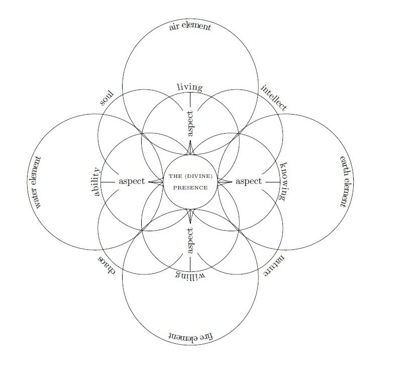 Figure III.2: Quadratic Origins: Ibn al-Arabi showed that everything in the World is based on some divine realities, and because there are four fundamental divine Names or Attributes: Living, Ability, Knowing, and Willing; the emergent worlds are always based on four fundamental facts, such as the four classical elements of Nature.
