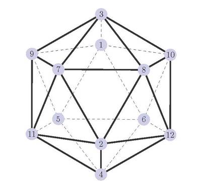 Figure IV.7: The Icosahedron has twenty triangular faces, twelve vertices, and thirty edges, and its dual is the Dodecahedron.