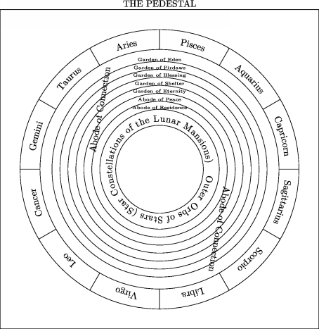 The sphere of the zodiac was the first orb to be created inside the Isotropic Orb; so called because it contains no stars yet nor any distinguishing features as it is homogeneous in all directions, but its surface was divided by human convention into the twelve equal parts that are traditionally assigned to the various zodiacal constellations, as in Table 4.1. According to the diagram in Figure 4.6 and Ibn al-Arabi’s comments on it in chapter 371 of the Meccan Revelations, it is evident that he was aware of the large distances between the galaxies because the Moon mansions are in our galaxy while the zodiac constellations are other galaxies placed very far away. In this vast space, Allah created the seven paradisaical Gardens, as named in the Quran and Hadith, with their different states and levels marking the symbolic “meeting-place” between the purely spiritual realities of the divine Throne and the sensible realities in the realm of the Pedestal. The specific names of each of the Seven Gardens are taken from related verses in the Quran and Hadith, and they are different from the Seven Heavens or Skies which are, for Ibn al-Arabi, the same seven celestial spheres where the five known planets plus the Moon and the Sun are revolving, as shown in Figures 4.7 and 4.6. The Gardens are actually eight, but the eighth, called: al-Waseela (the Connection), is a special rank included throughout these Seven Gardens whose names appear in the figure.