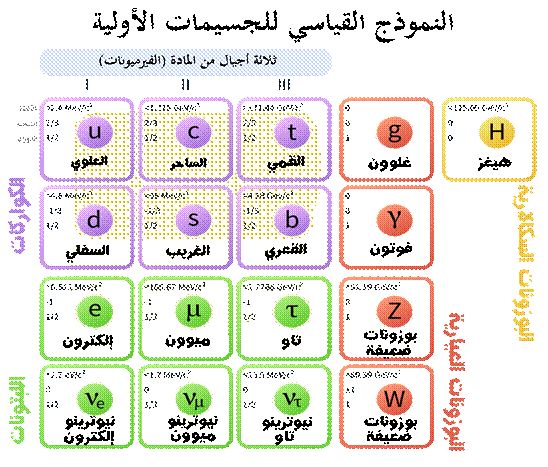 بعد دراسة متأنيّة استغرقت بضع عقود أخرى، استطاع العلماء ترتيب هذه الجسيمات الكثيرة وتحديد تركيبها الداخلي، وتبيّن أنّها تنبثق جميعها من ثمانية وعشرين جُسيما أوَّليًّا لا يمكن تقسيمها أكثر من ذلك، وهي التي تشكل الآن ما يُسمى بالنموذج القياسي للجسيمات الأولية (standard model of elementary particles)، كم هو موضح في الجدول المرفق. وقد أُلحق مؤخراً بهذا الجدول جسيم آخر له صفات خاصة هو جسيم هيغز، ليصبح مجموعها تسعة وعشرين جُسيماً أوَّليًّا، وهو ما يُذكِّرنا بعدد حروف اللغة العربية، الثمانية والعشرين، والتي يُلحق فيها أيضاً حرف لام ألف لتصبح تسعة وعشرين.
