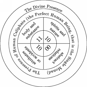 In the same way, the contingent thing that exists by itself and is not embodied, is the substrate of what it carries of spiritual descriptions and perceptions (that is the bearer of meanings) that its essence may not remain without them. And they are renewed on it just like the renewal (or the re-creation) of the forms in the bodies; the image of the body is a form in the monad but the terms (by which the object is described) are related to the images (of the body, and not to the body itself). So the images are the ones which are defined, and one of these terms is the monad in which these images appear. That is why they (i.e. the philosophers) call the images monad(s) because they take the monad in the term of the image (while the actual single Monad has passed to create other forms which are continuously becoming its images but we imagine them individual monads).’ [II.454.14]In his Insha al-Dawair (“Constructing the Circles”), Ibn al-Arabi explains the different categories or types of existence and he represents that schematically as depicted in Figure 4.2.