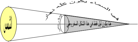 وهكذا فإنّ لكلّ فلك يوم له نهار وليل بالنسبة لما تحته أما بالنسبة له فهو يوم لا ليل له ولا نهار، تماماً كما هو الأمر بالنسبة ليومنا المعتاد على الأرض فهو لنا يوم له ليل ونهار أحدثته حركة الشمس (الظاهرية) ولكنّه بالنسبة إلى الشمس وما فوقها فهو يوم لا ليل له ولا نهار. فنحن دائماً إمّا أن نكون تحت تأثير ليل الأسماء الإلهية أو تحت تأثير نهارها، لكنّ هذه الأسماء في حدّ ذاتها ليس لها نهار أو ليل بل هي نورٌ كلّها. ويعطي ابن العربي وصفاً علمياً دقيقاً لما يحدث على الأرض من شعاع الشمس حيث يقول إنّه يسبّب ظلاًّ للأرض يمتد في الفضاء على شكل مخروط،[224] كما هو معروف الآن، وكما نوضّحه في الشكل التالي: