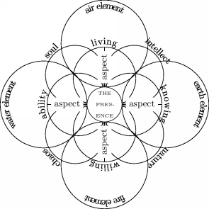 Because Allah created (the Perfect) Human Being “according to His Image” [I.163.20], these same divine Attributes are potentially manifest in every human. Also, as Ibn al-Arabi says, Allah created the world and everything in it on the image of (the Perfect) Human Being [II.652.25], and so the world with the Human Being is “on the Image of the Real”, but without the Human Being it would not have this perfection [III.343.25]. Therefore, these same attributes should be available and essential in the world as well. That is why, he explains, the numbers four and seven play central roles in the world: the four elements in Nature (earth, water, air, fire), the four time-cycles (year, month, week, day), the seven heavens, the seven days, and so on. The two cosmologically fundamental four-fold groups that emerged out of the four mother Attributes that are the four aspects of the divine Presence of the Essence are the four elements and the primordial cosmological principles of the Intellect, Soul, Dust and Nature, as depicted in Figure 4.9.